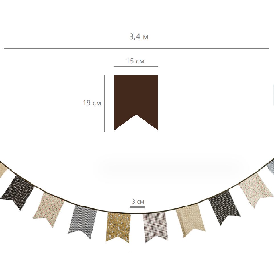 Гирлянда состоит из 12 флажков, общая длина составляет 3,4 м, расстояние между флажками 3 см, длина матерчатых флажков 2,1 м, длина лямок с обеих сторон по 50 см