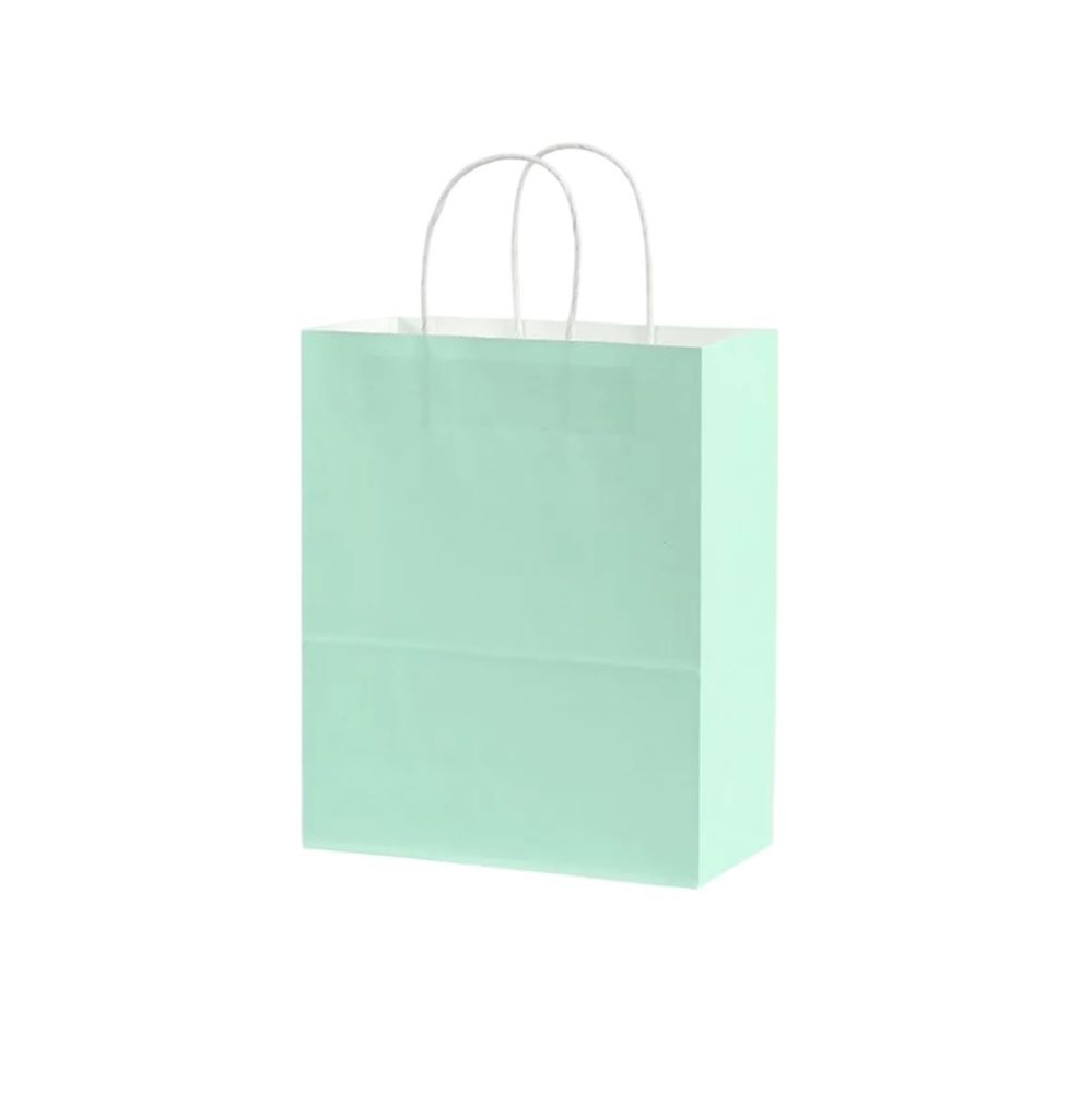 Подарочный пакет из крафтовой бумаги пастельного оттенка с белыми бумажными ручками и белой внутренней стороной.